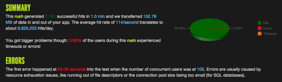 That is roughly 19 million hits in a day. I monitored the CPU load during that test and it peaked at 80% and settled around 68%. No too shabby. ((I don’t know how “real” this testing system is, but it is pretty neat.))