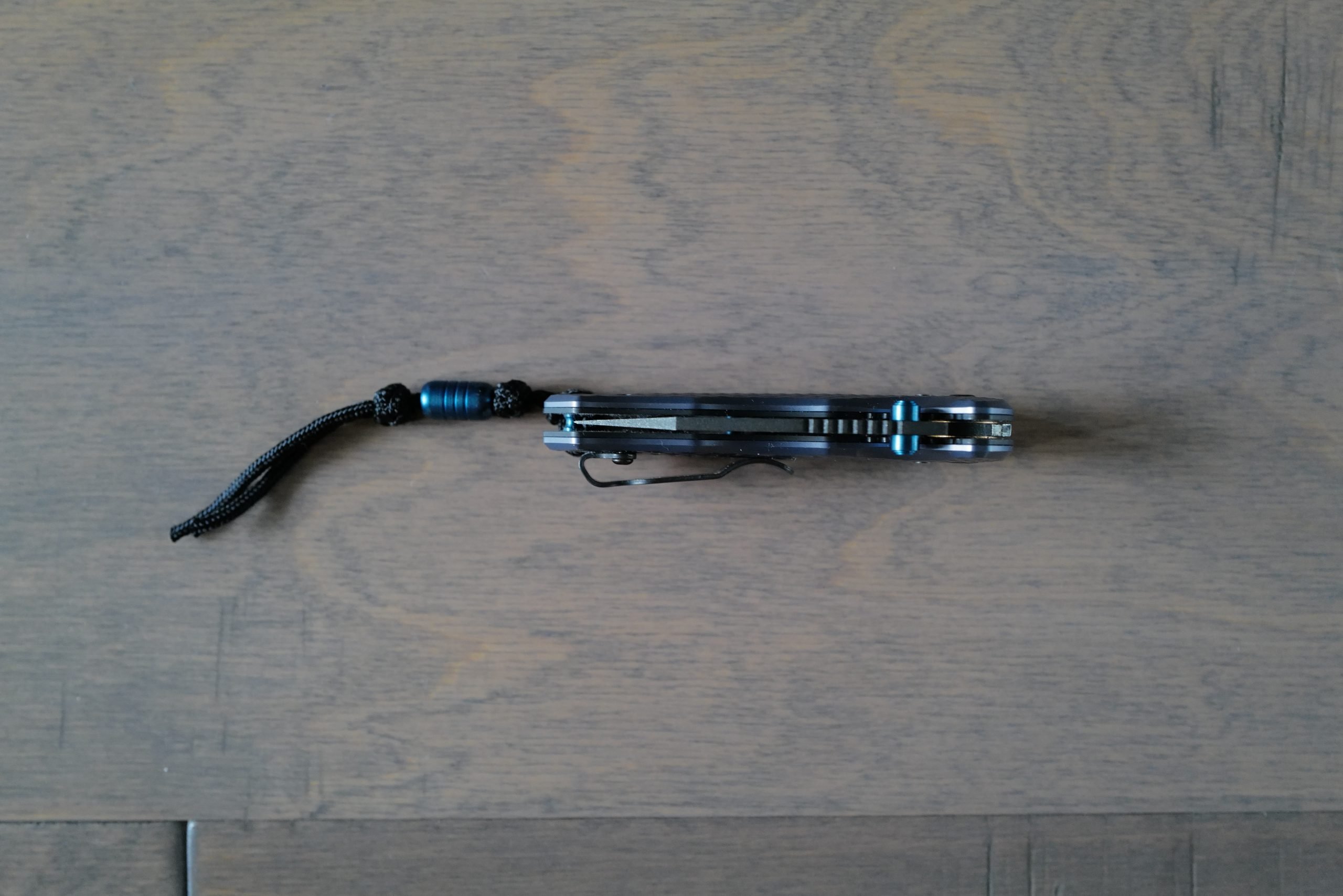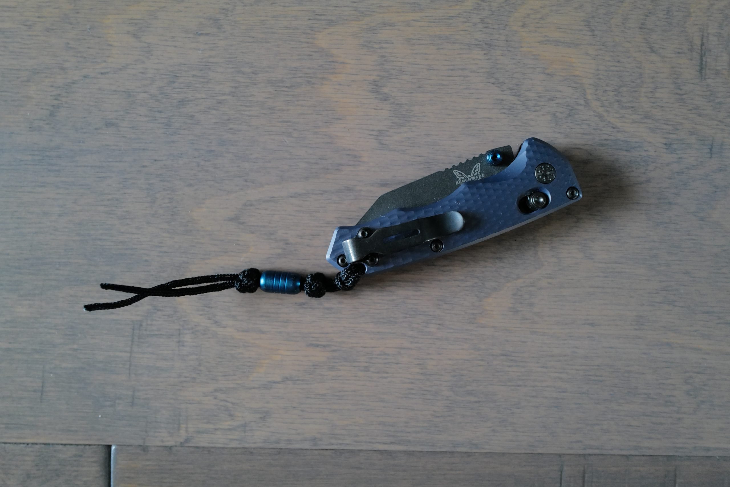 The Wharncliffe shape also helps tamp the looks, which oddly works well here. It is mated to anodized billet aluminum scales with the axis lock, dual thumb studs, and reversible pocket clips, and in a first for me with Benchmade, a lanyard with a lanyard bead.