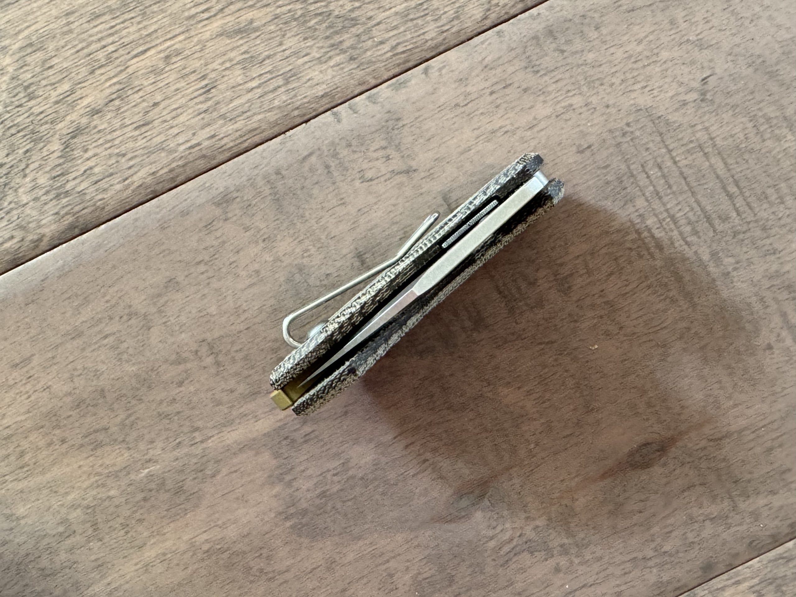 This knife is equipped with green canvas micarta scales (favorite of mine), a reversible wire clip that is just as shitty as every wire pocket clip, and uses 20CV for the blade steel. There are other steels available for this knife, but I only tested this one.
