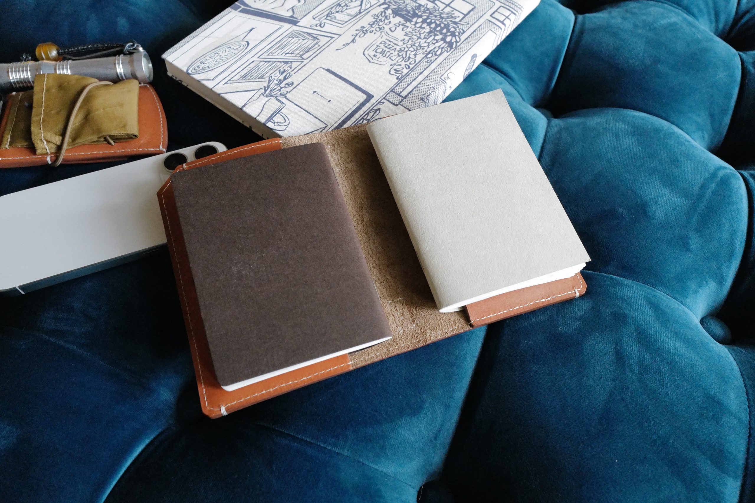 The design and heft of this allows it to lay flat when open, even if your notebooks will not. It’s easy enough to write in the Papa without removing the notebooks. I’ve found that the reductive window pocket design looks really cool, but is actually not ideal for using them day to day. They are certainly not bad pockets, but there are better designs out there than this for functionality.