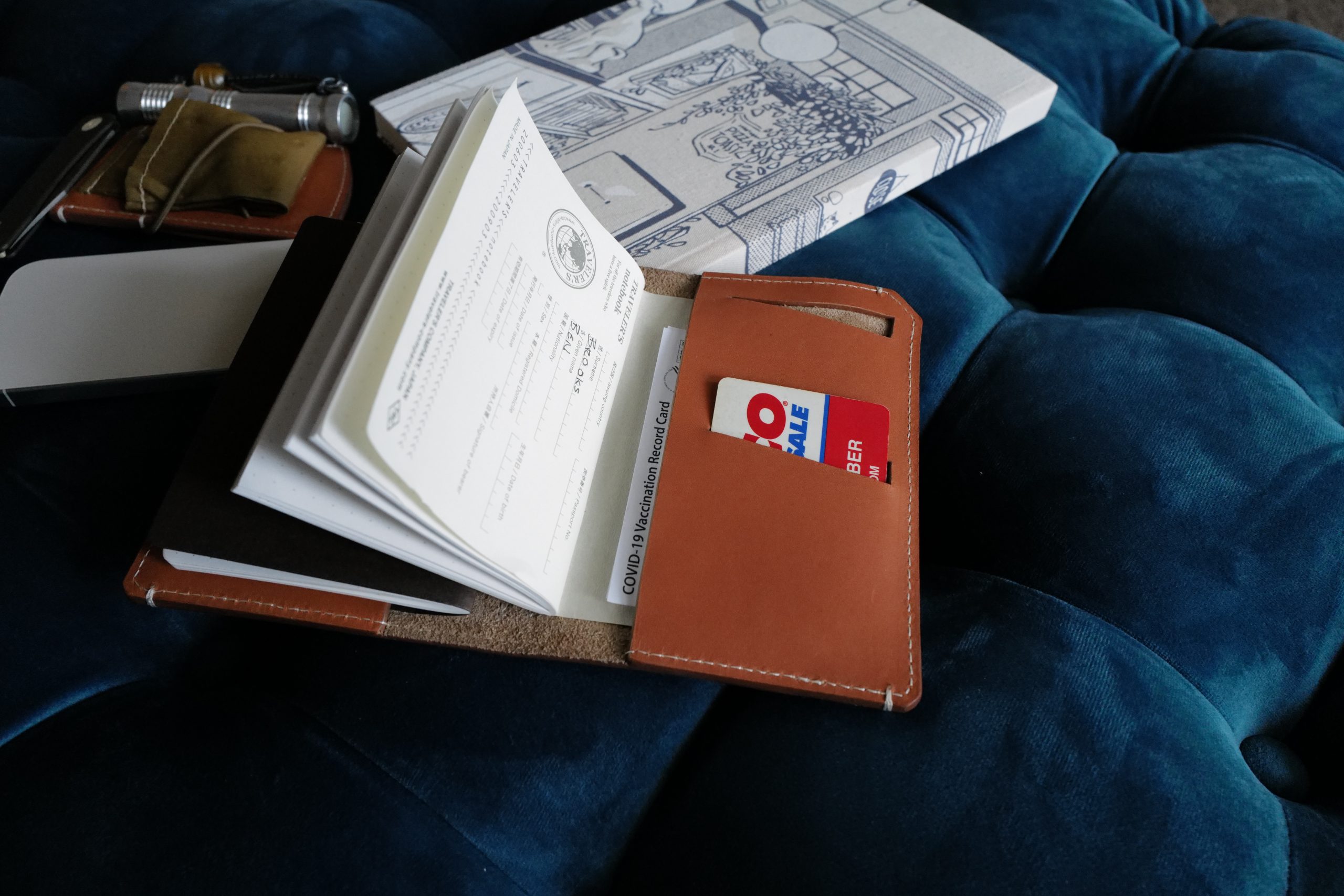 I’ve been using this for a while now as my travel sized notebook. I keep two Traveler’s Company Passport Notebooks in it. I also have found it holds vaccination cards well, which at this point serves more as a reminder of a fuckin nutso time than it provies any value. Some cash, my Costco card because I never have that when I need it, business and calling cards, my Passport Card (great backup photo ID), and my Tactile Turn Slim Short Side Click pen which is the perfect pen for this slot.