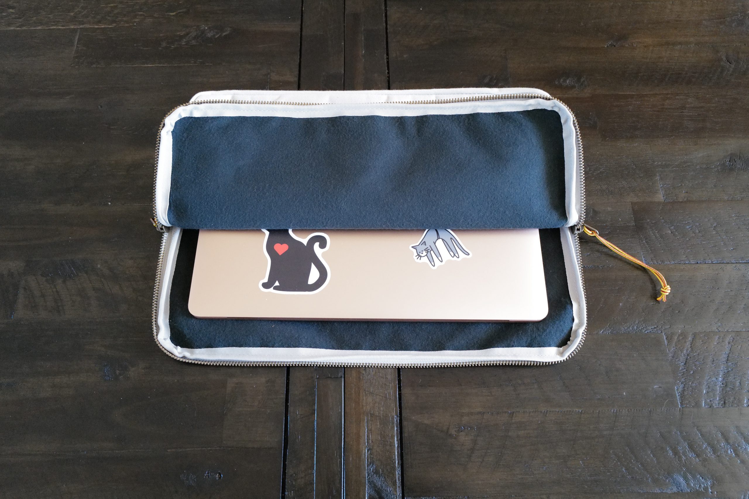 - Sizing: although these are both very different pouches, I’ve found them to both be really nicely sized for the intended uses. And by that I mean they are not slightly too small to fit what you’d actually want to carry, nor are they comically large and thus too bulky. Generally they seem to perfectly hold what they are designed to hold. The laptop sleeve holds my MacBook Air really nicely (the the images are of my daughter’s older MacBook Air), without any complaints. The Handy Pouch holds a lot of gear in a really compact form factor, without being at that annoying sizing where seemingly common objects won’t fit in the direction which makes the most sense for them.