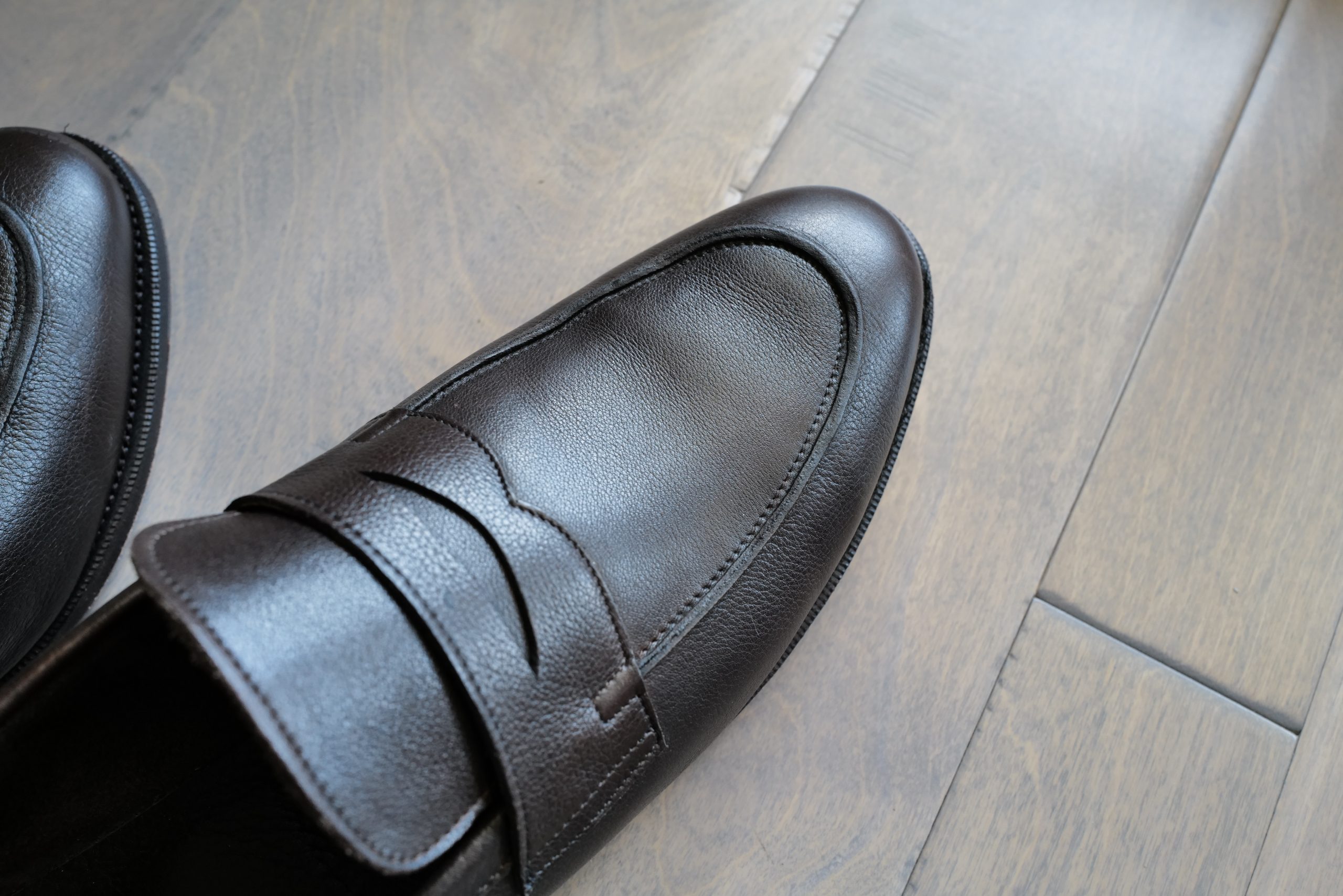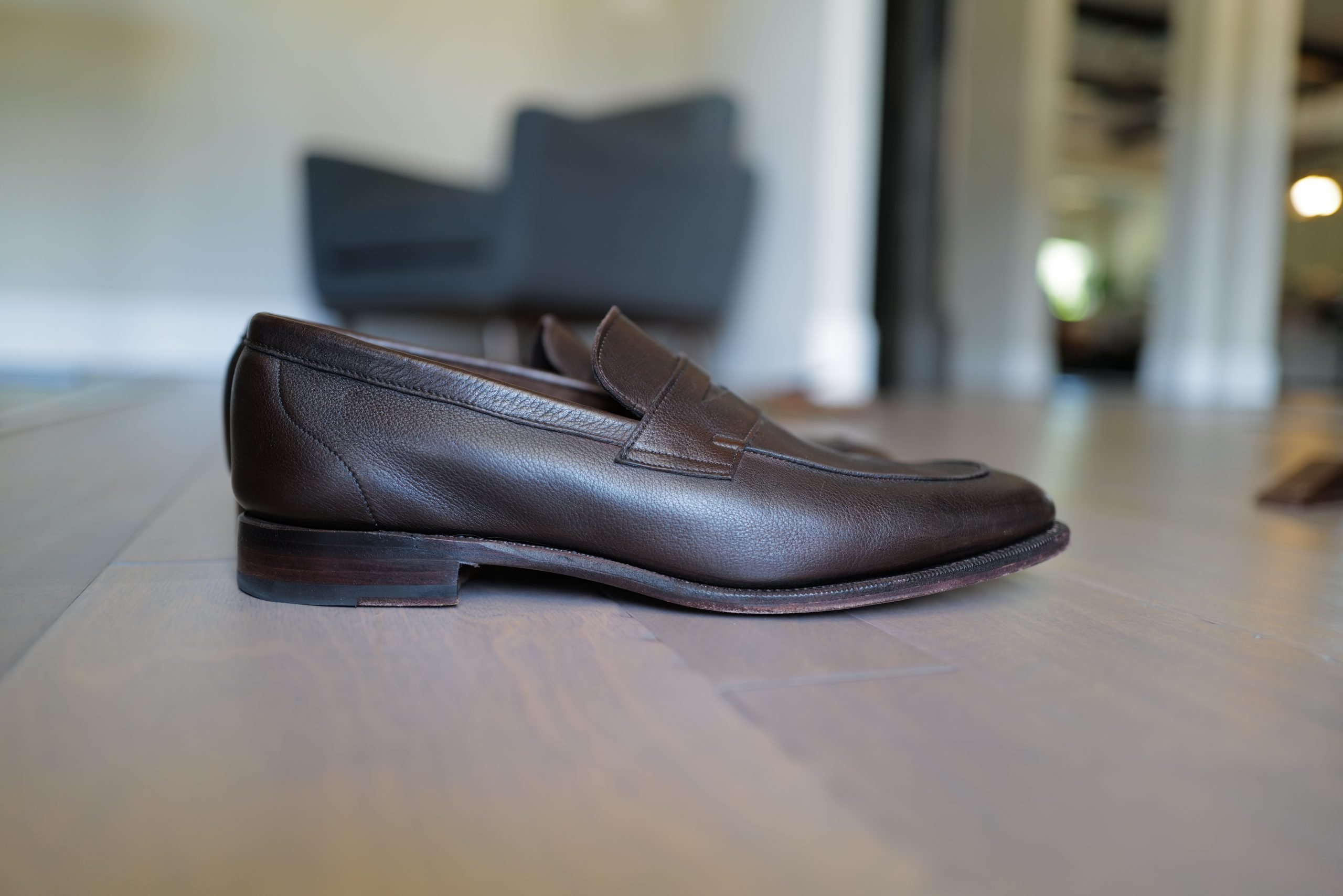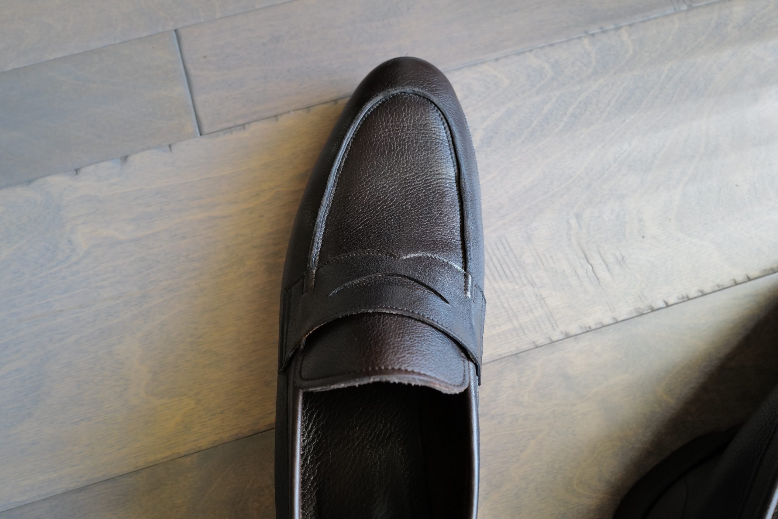 These are an Italian Penny Loafer in style, with a ‘Flex’ Goodyear welt, unlined, with soft calf leather. This means it’s a little sleeker and dressier than an ‘American’ penny loafer. It’s fully rebuildable by a cobbler, whenever the leather sole wears out. And the leather is very soft to the touch, with a slight pebbling to the texture. Being unlined means that this has no additional materials coating the inside of the shoe, so it should wear cooler (also why it’s called a summer shoe).