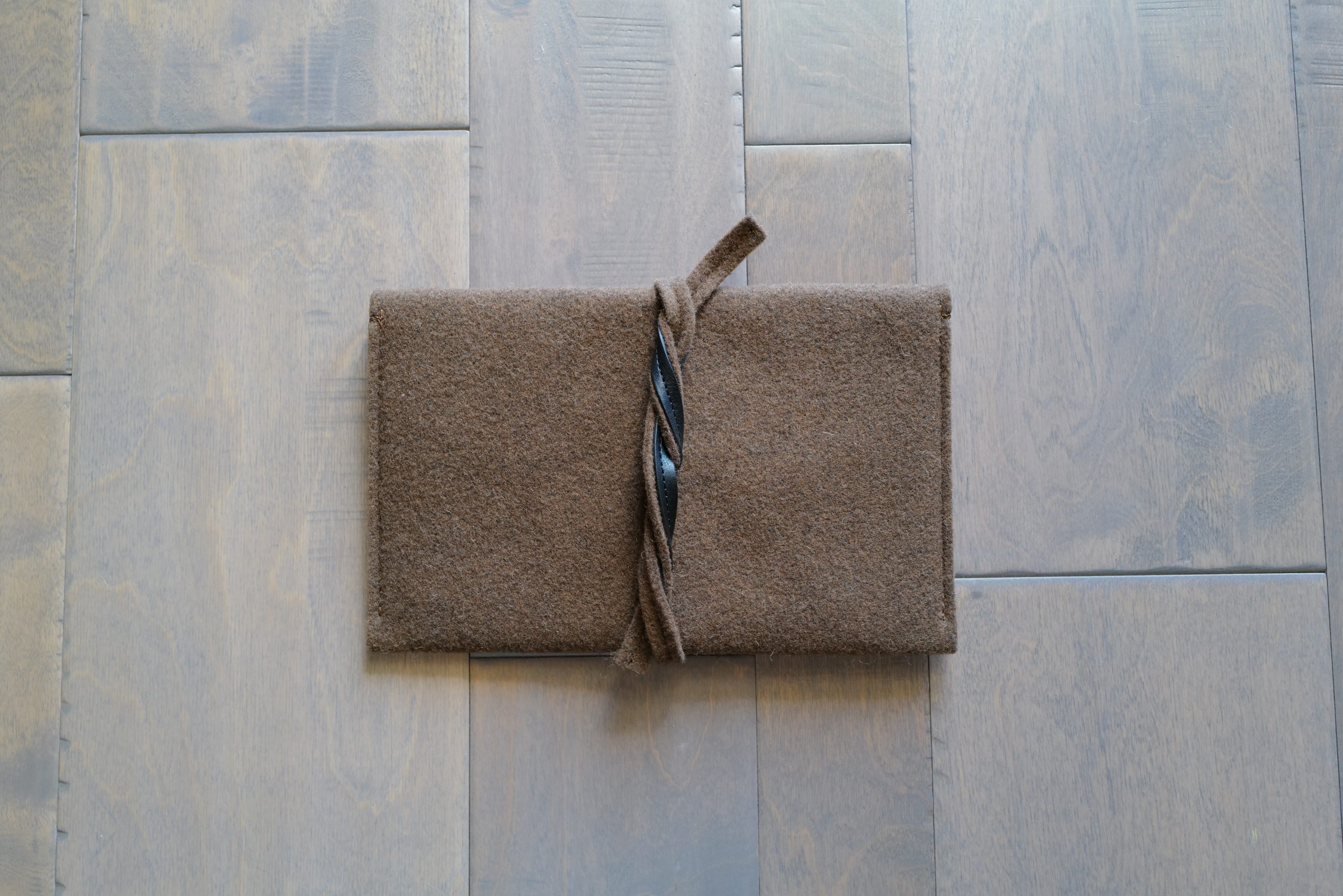 The idea behind this is to hold a notebook and a pen or two. It’s essentially an envelope design, with two straps long enough to wrap around the entire thing and tie. It measures in at 9.8″ x 6.3″ x 0.8″ — which is a pretty nice size.