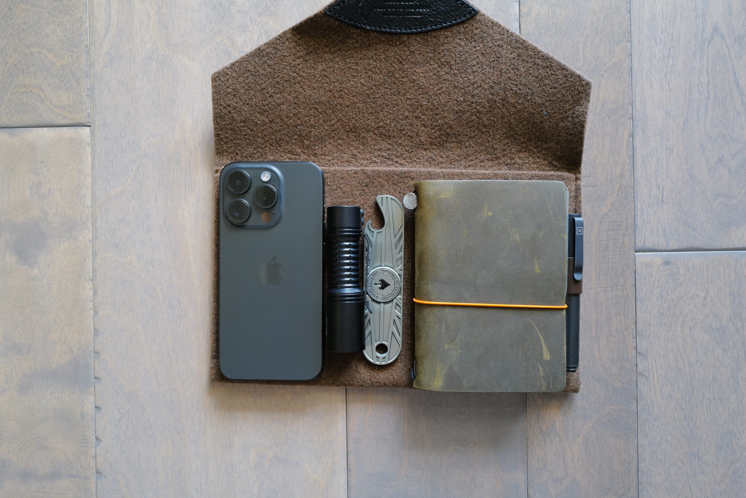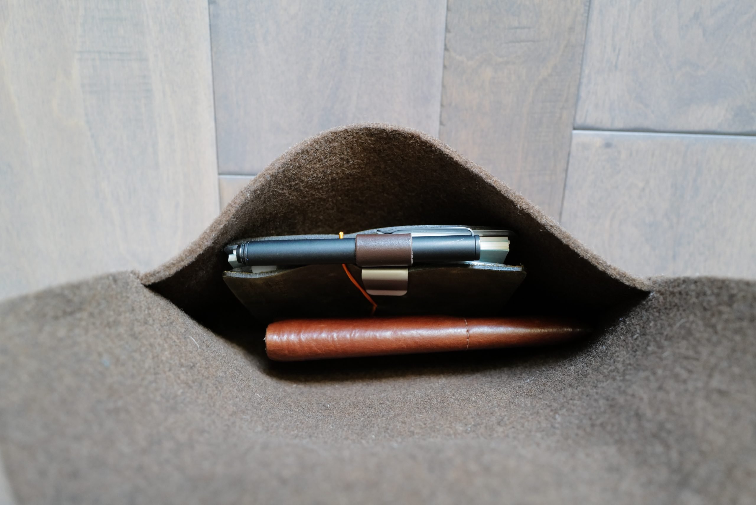 The items vary widely and I wasted a lot of time trying to dig through my pouch pile to find something suitable. So I set out to find a pouch which would work well enough across all my uses. I’ve kind of found it in the Hardgraft Notebook Wool Wrap.