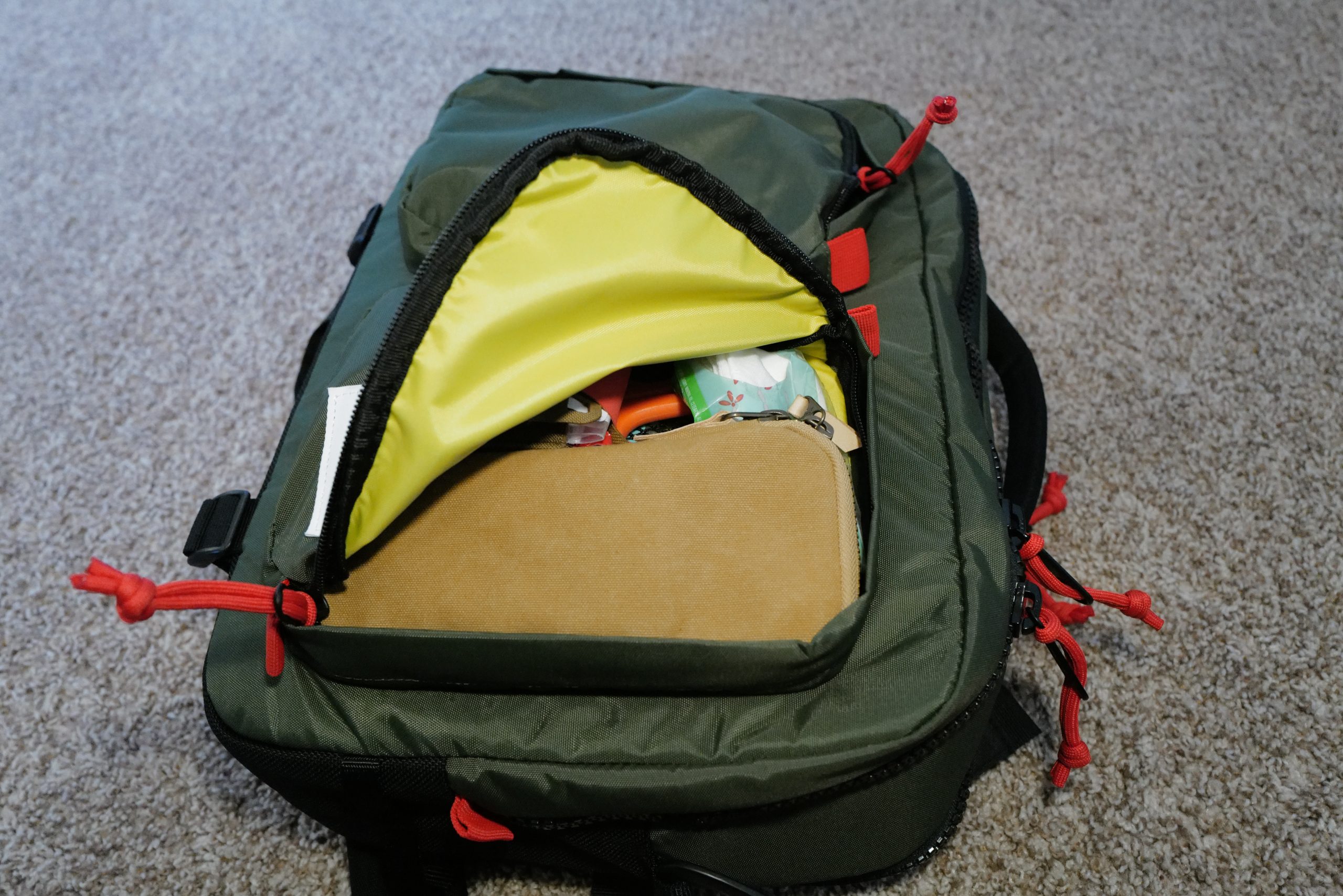 Oddly I found that this bag does not flex the size much. Meaning you can’t stuff a bulbous item into the main compartment and have the bag bulge around it allowing you to zip it closed. In something like the 24hr, this is much easier to do. This is likely due to the overall construction/structure and the padding. Something to note if the main compartment does not fit the shape of things you carry often, like say a water bottle.