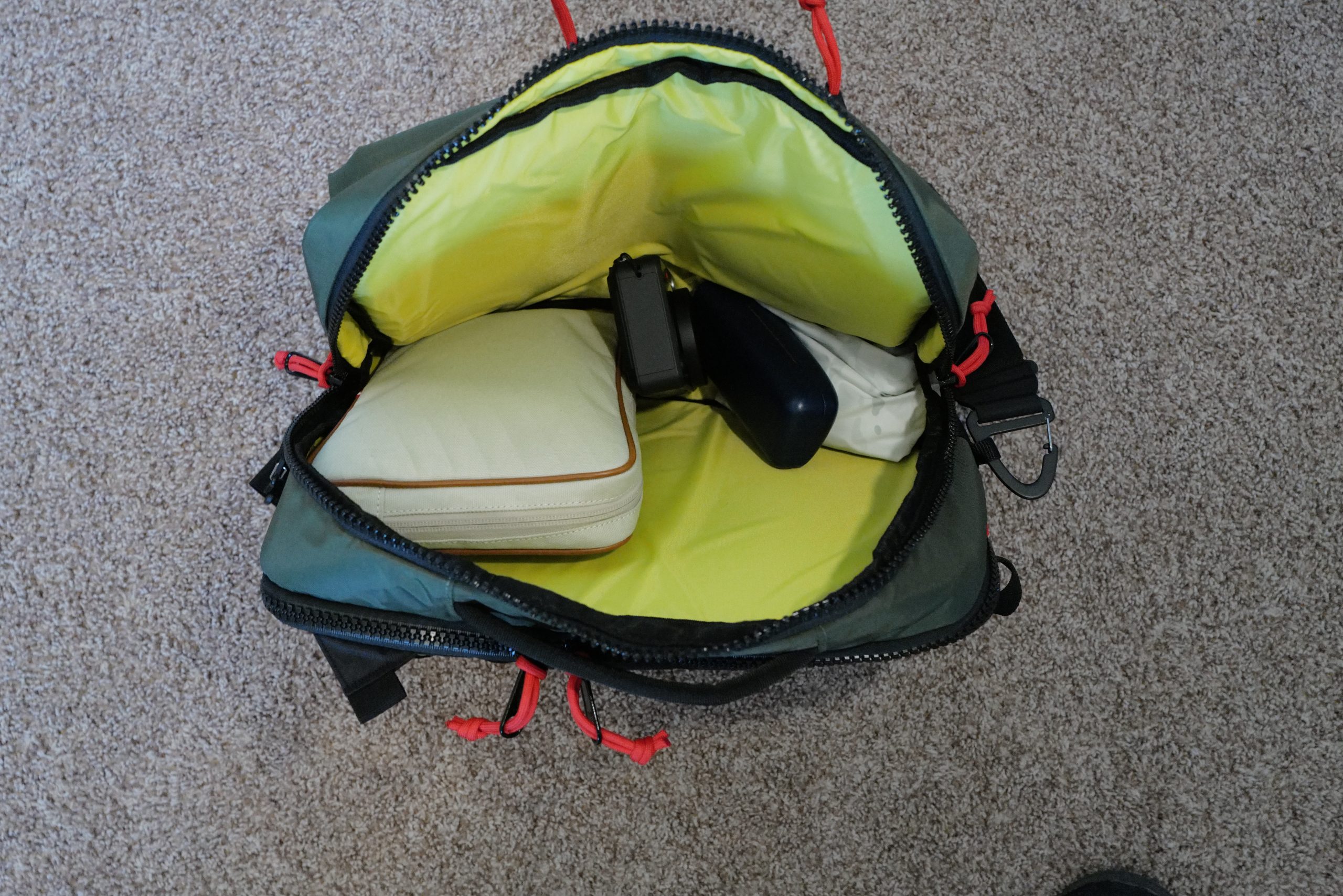 Topo Designs lists the measurements at 15.5″w x 11.5″h x 4″d, giving you 14L of space. I don’t see the 14L of space in practice, and find that because of the structure of the bag, it feels much more like a 12-13L bag — not small in any sense but not as large as others of this general footprint I have.