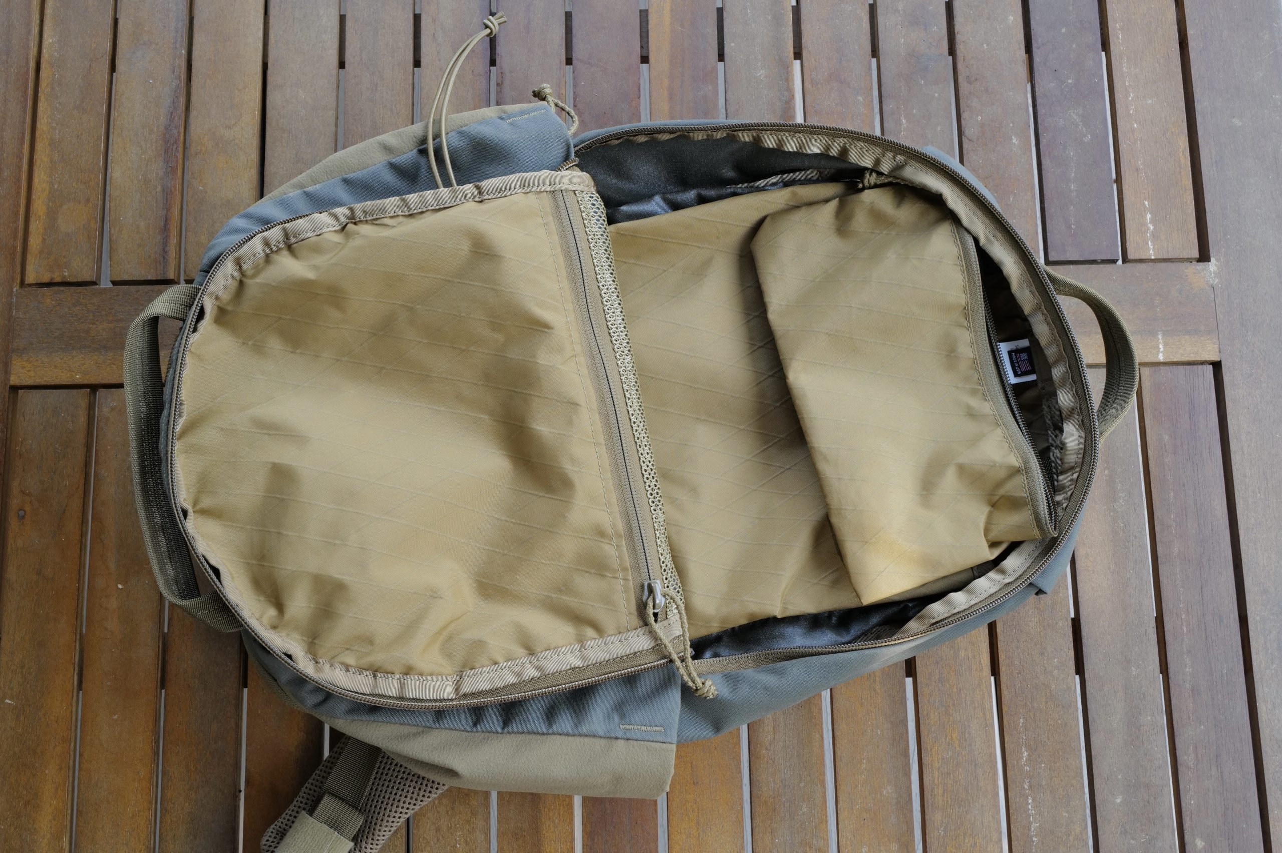 Both water bottle pockets are sized to fit 32oz Nalgene bottles. It’s compatible with the ‘Sherman Pocket’ Kifaru sells, and has dual water bladder hose ports. There’s no laptop sleeve, or any tech niceties in this. The bag opens about 2/3 of the way down the side, dropping slightly into the water bottle pockets. The front outer pocket is deceptively large as well.