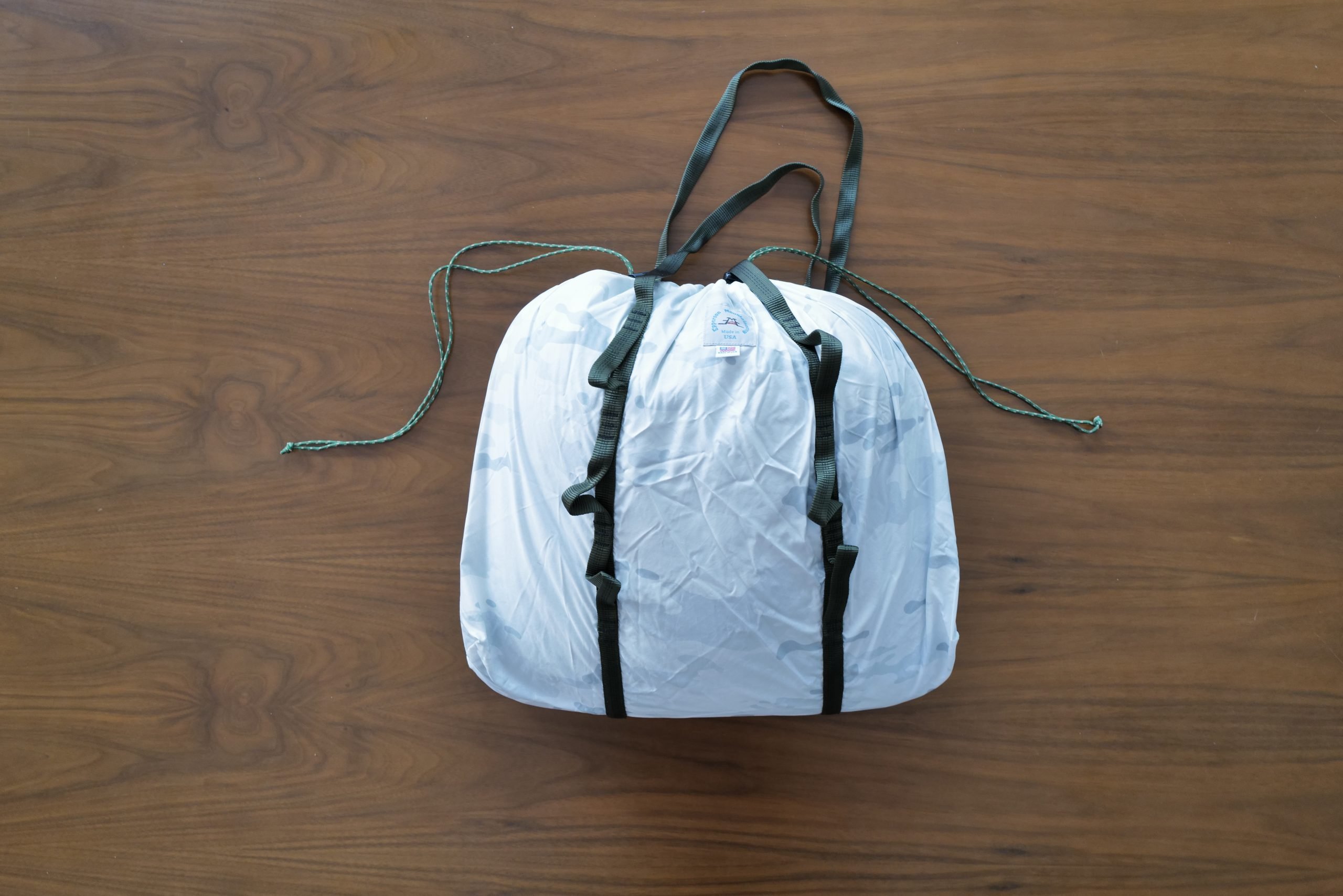 The bag is ripstop 70D nylon/poly blend. It is really wild as it has a touch of stretch in it while being very thin. It feels very durable overall. The entire kit comes in at 2.82oz.
