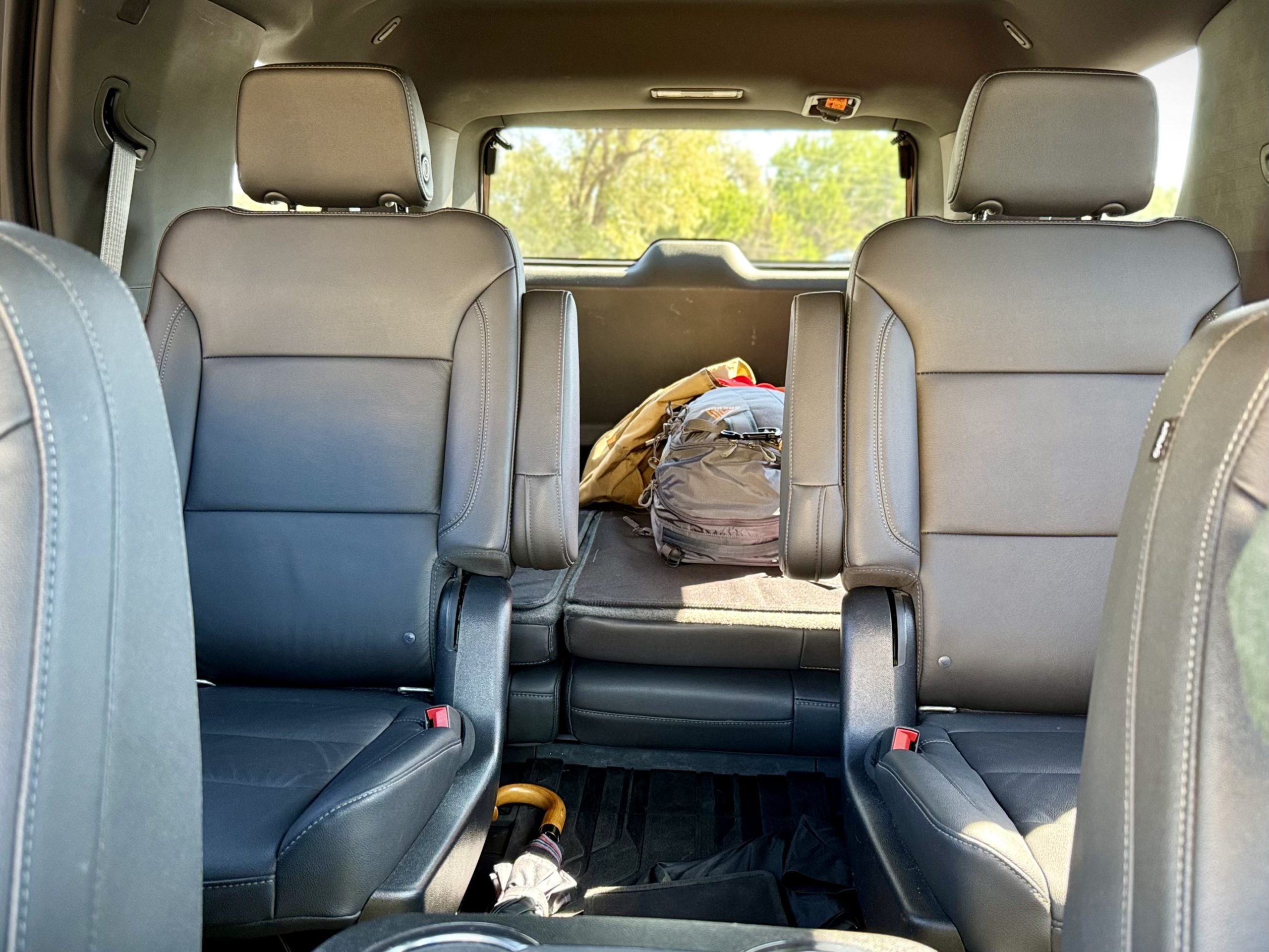- Capacity for gear: this use to be a huge tradeoff with Tahoes, if you put up the third row you had no room for gear in the back — so you needed to get the Suburban. If you are used to smaller SUVs, you know what I mean. This model of the Tahoe resolves that issue in an impressive way. With the third row in use, you have room for about four carry on sized suitcases in the back. You can get creative and fit more, but that’s what fits easily. That’s not huge, but it’s also not nothing. Put the third row down, and you have an impressive amount of cargo space, easily accessible from the second row or back hatch of the car. Fold the second row flat, and you’ll run out of money at Costco before you fill it — or at least I would.