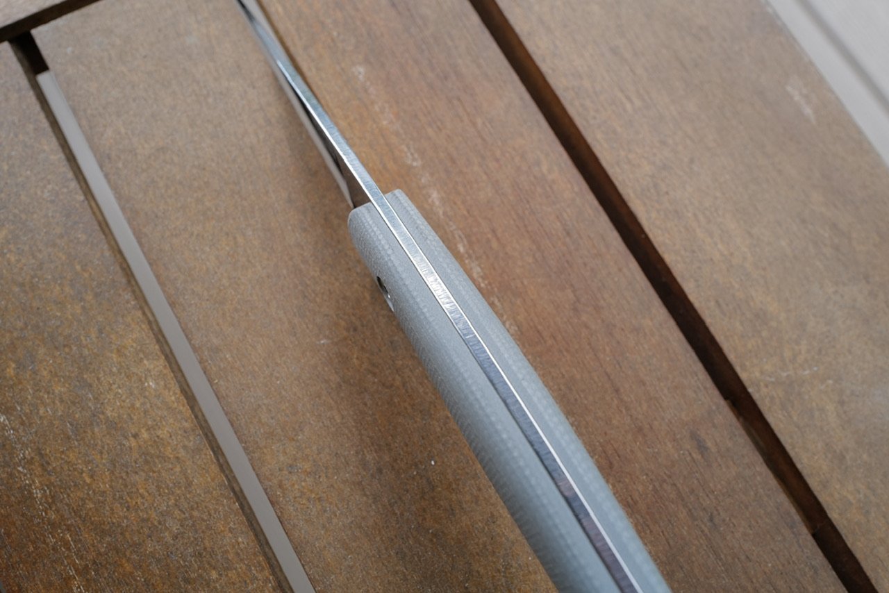 The edge came sharp, with what MKC calls a “sharp working edge”. I took sometime to look into what MKC means by this, and generally it means that they create a very sharp edge, but they do so using a lower grit surface. The end result is a very sharp knife, but with more (I’ll call it) nano-serrations to the blade edge. MKC claims that this means the knife stays useable (workable) much longer, even when the blade seems more traditionally dull, because there’s still that serration to the edge for cutting.