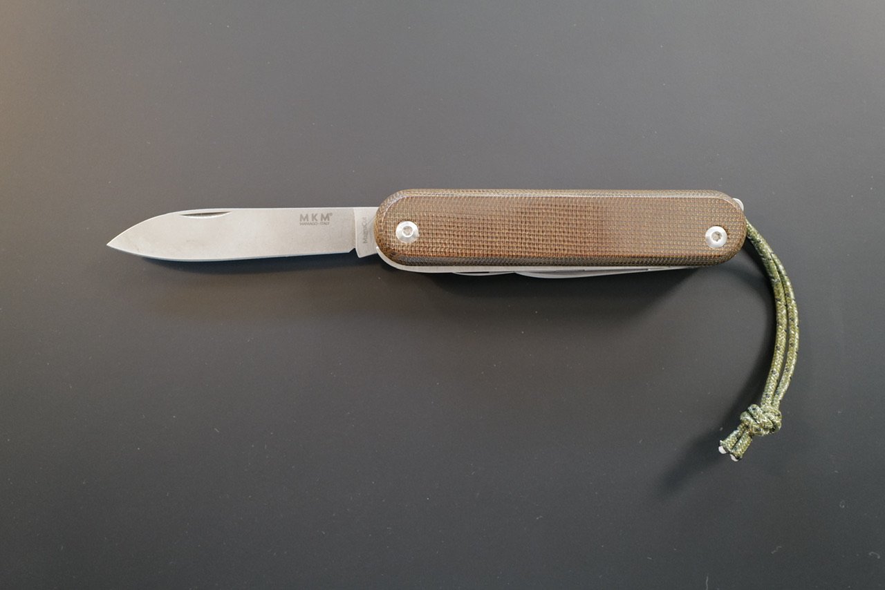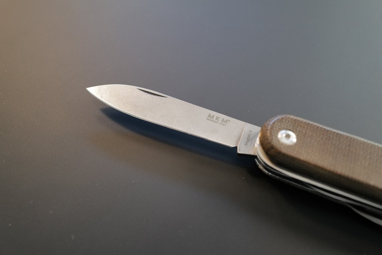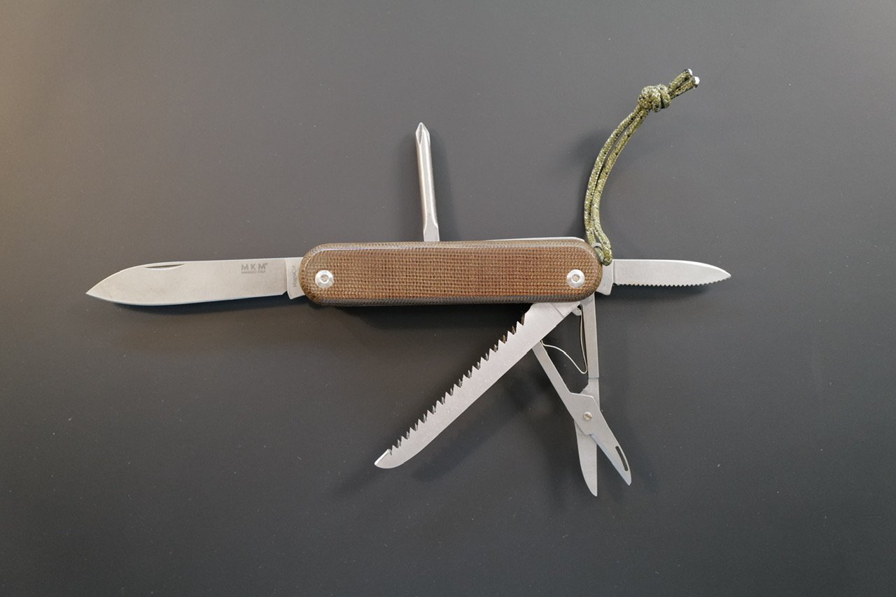 Take a Victorinox, strip it down, upgrade the materials, and out you get the MKM Malga series of knives. This ‘5’ variant has five tools: Knife, small serrated knife, scissors, saw, and a Phillips driver. Only the primary knife blade is labeled as Magnacut.