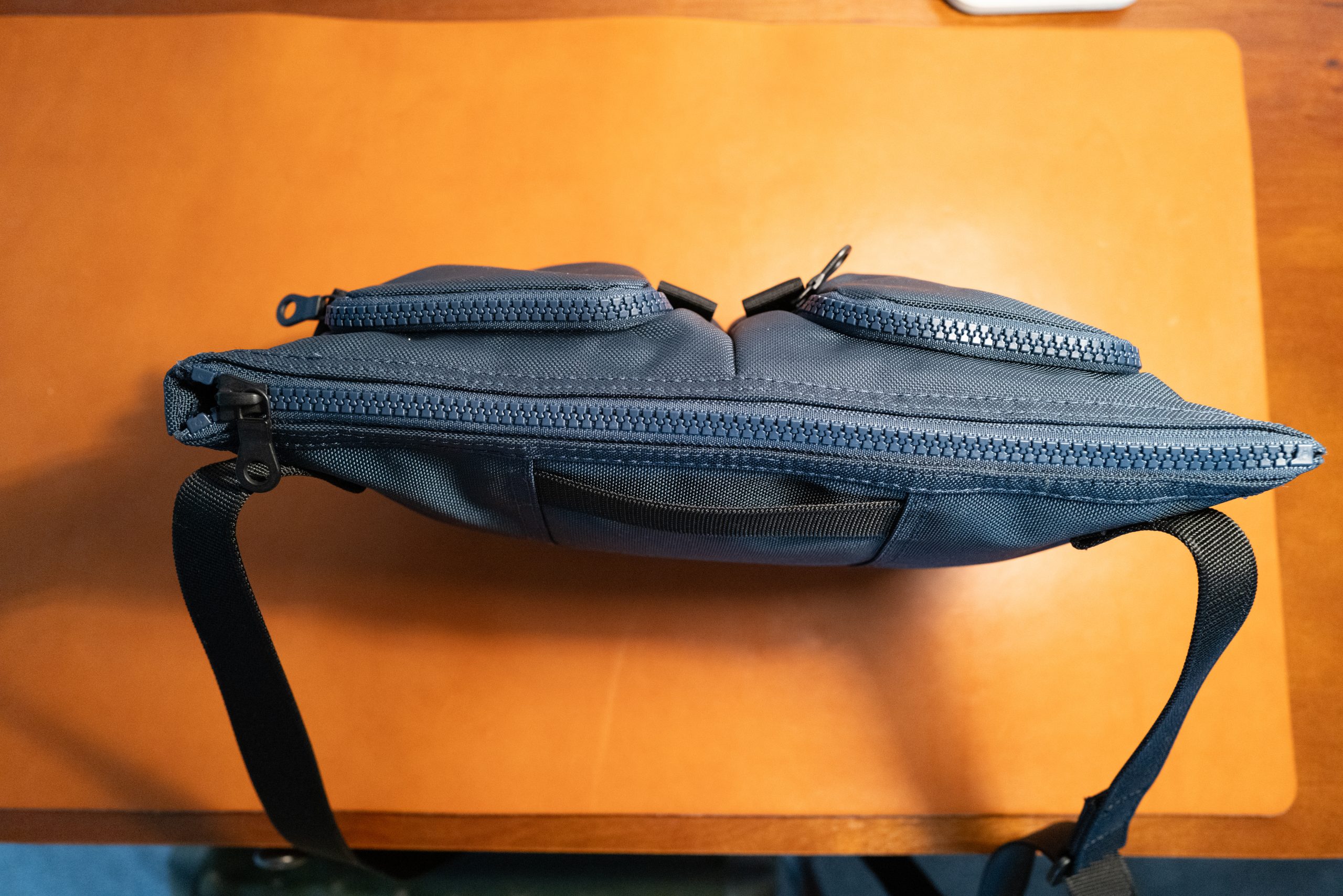 - The two front pockets both have the zipper running in the same direction. Which means that when they are closed one zipper pull is at the center of the bag, and the other at the edge. What I would expect is the opposite of this, that both zipper pulls sit on the edges, or the center, when closed and thus run away from each other. This tends to trip me up a bit when I go to grab for the zipper pulls.