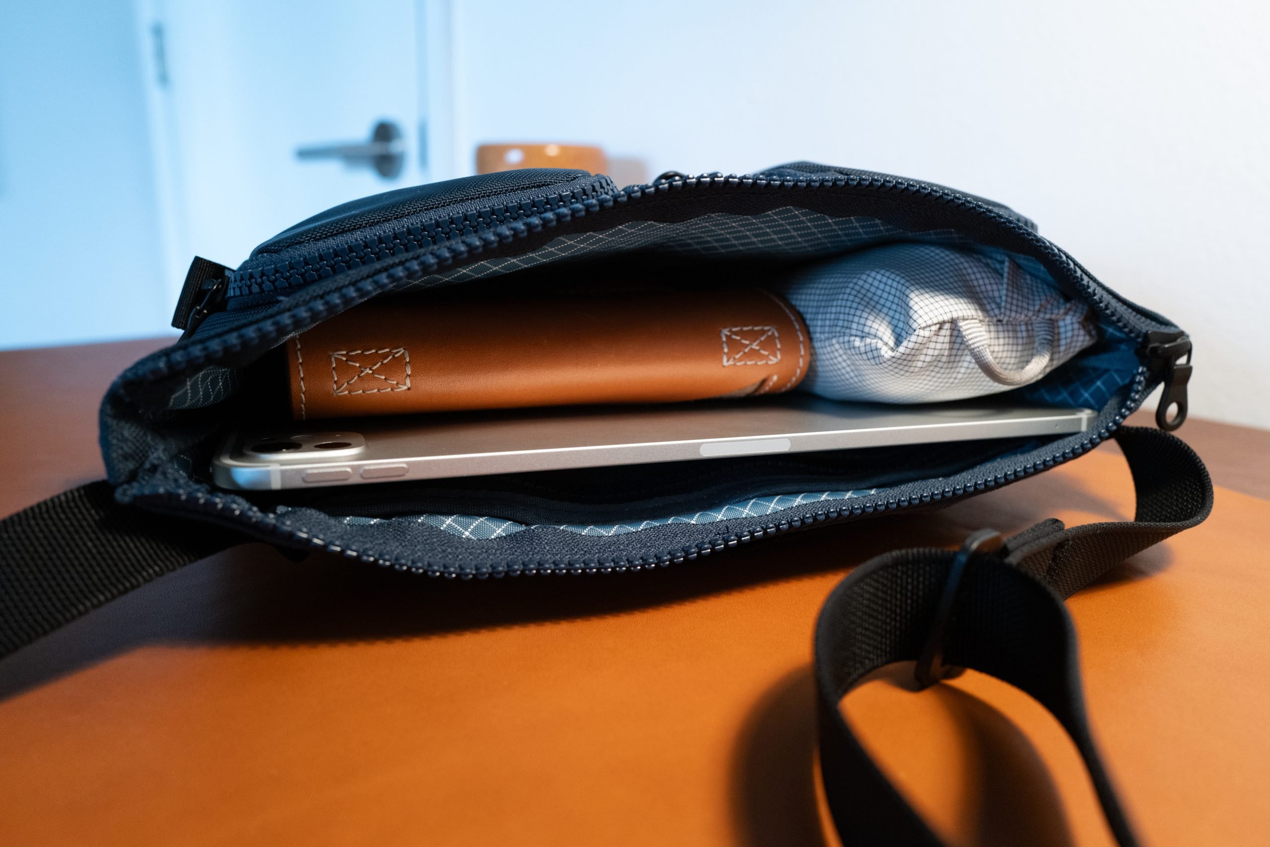 - The Main compartment opens with a simple flat and straight zipper across the top. Inside is an open space with a single hanging pouch, which provides an open top pocket, and a zippered compartment. This hanging pouch is lightly padded, it’s here in that the open top hanging pocket you’ll find the best spot to store your phone. While this compartment can squeeze an 11” iPad Pro, it won’t do so with much else in the pocket or on the device. It also will not hold my Leica Q2 and still zip closed (though I suspect it might hold an X100 series camera).