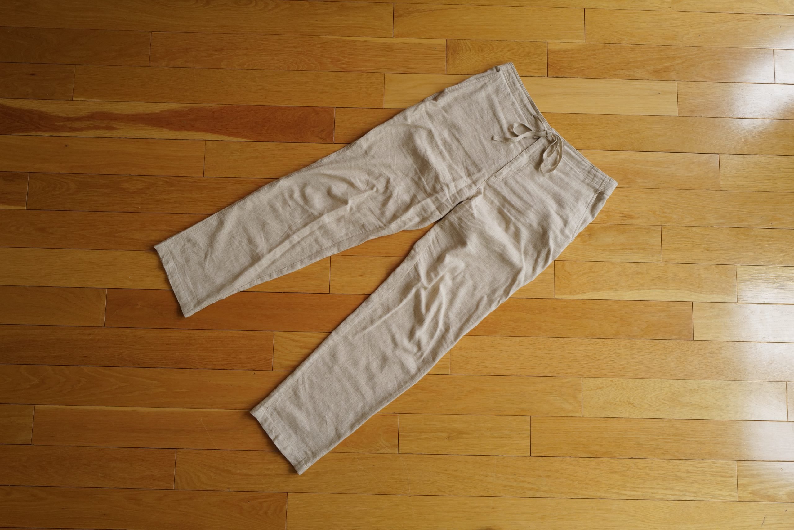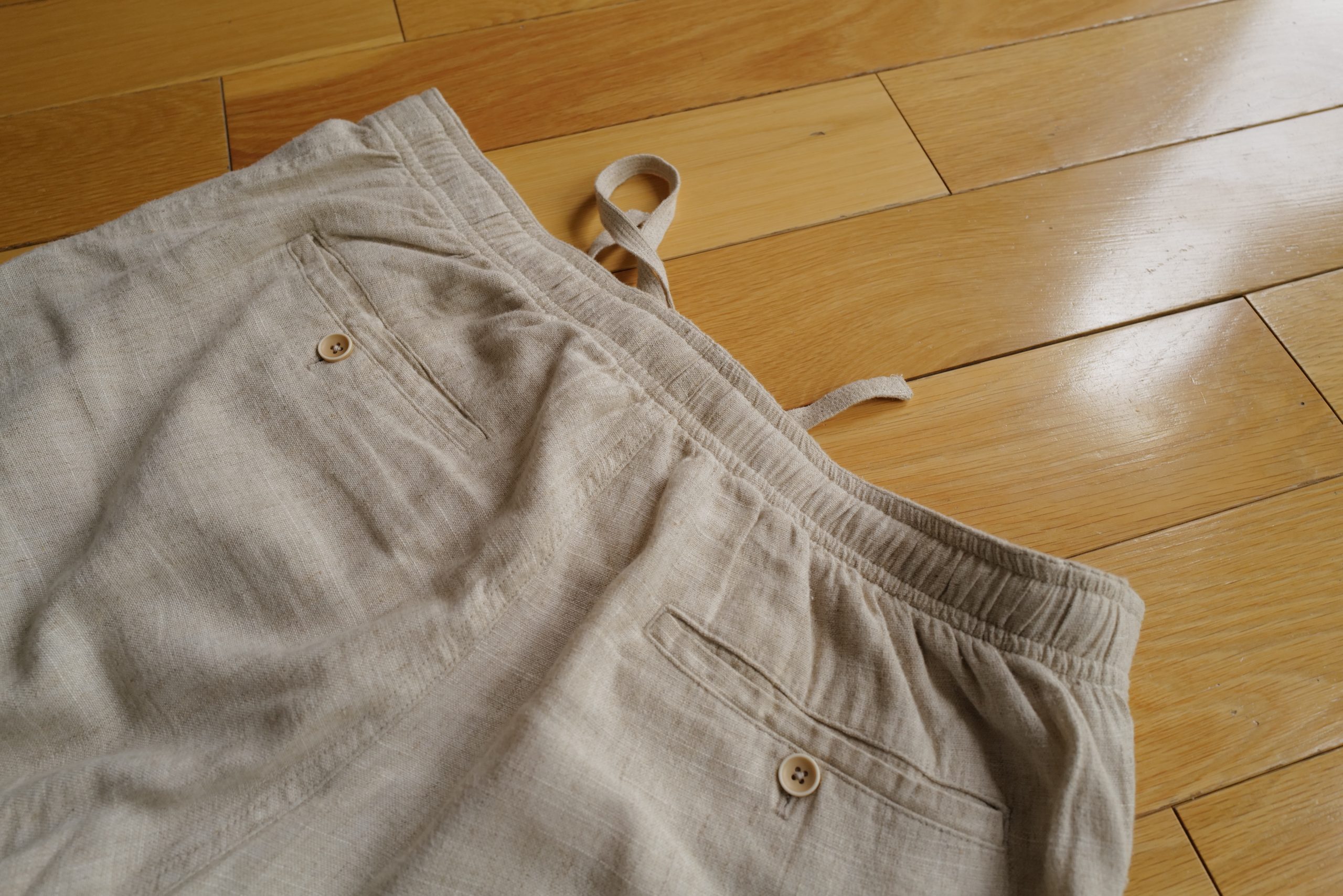 Made from a 55% linen, and 45% viscose material which has enough structure to it that even in the sand color I have there’s no opacity issues. The viscose helps keep the linen looking tidy, and generally shows fewer wrinkles than my 100% cotton chinos would.