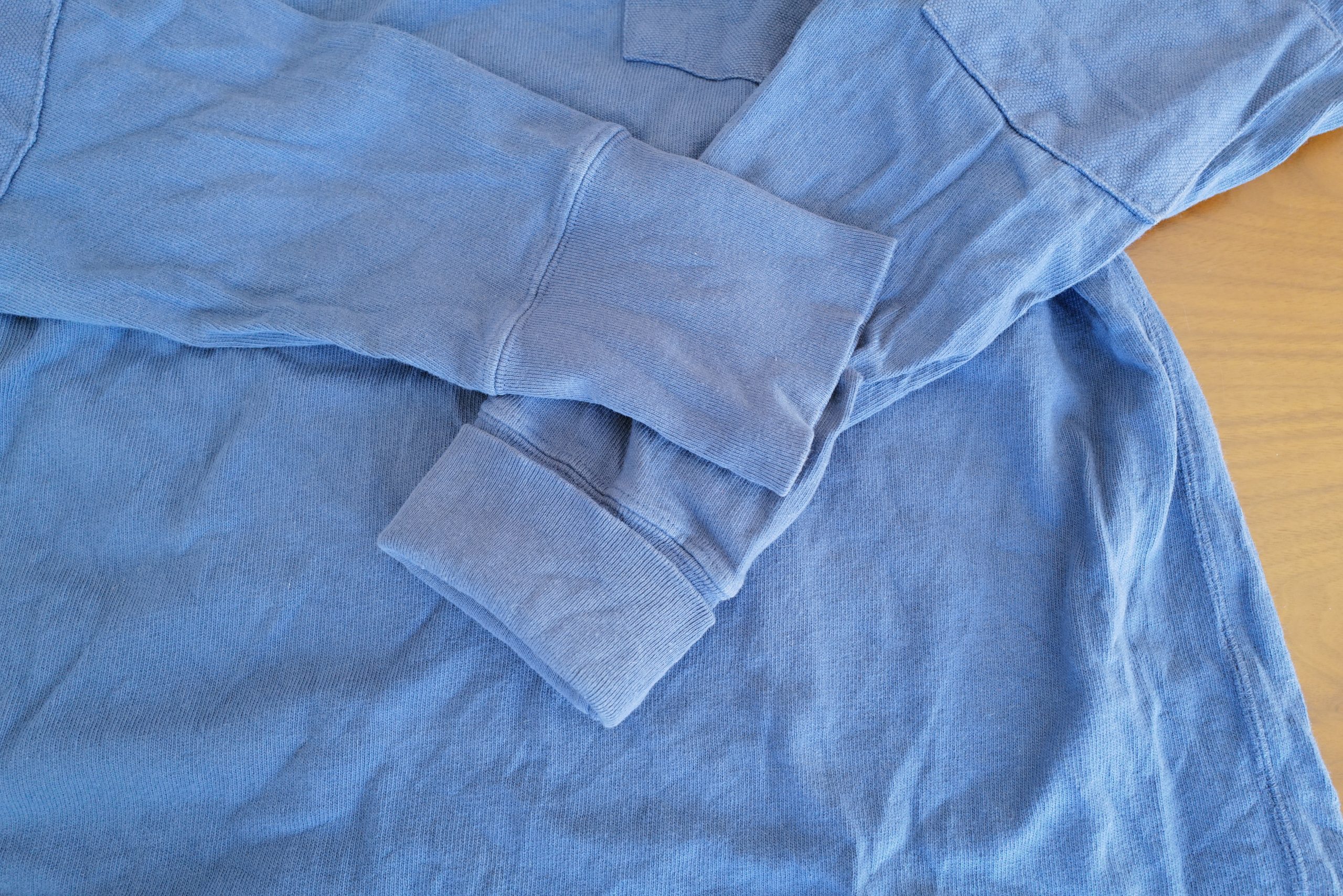 The look is very remeniscent of a crewneck sweatshirt, but the collar is an ever so slight mock neck. The sleeves are a raglan cut. And, the rubbed cuffs are oversized — effectively designed to be folded back on themselves one full fold — even with my gangly-ass-long arms the sleeves are still long enough.