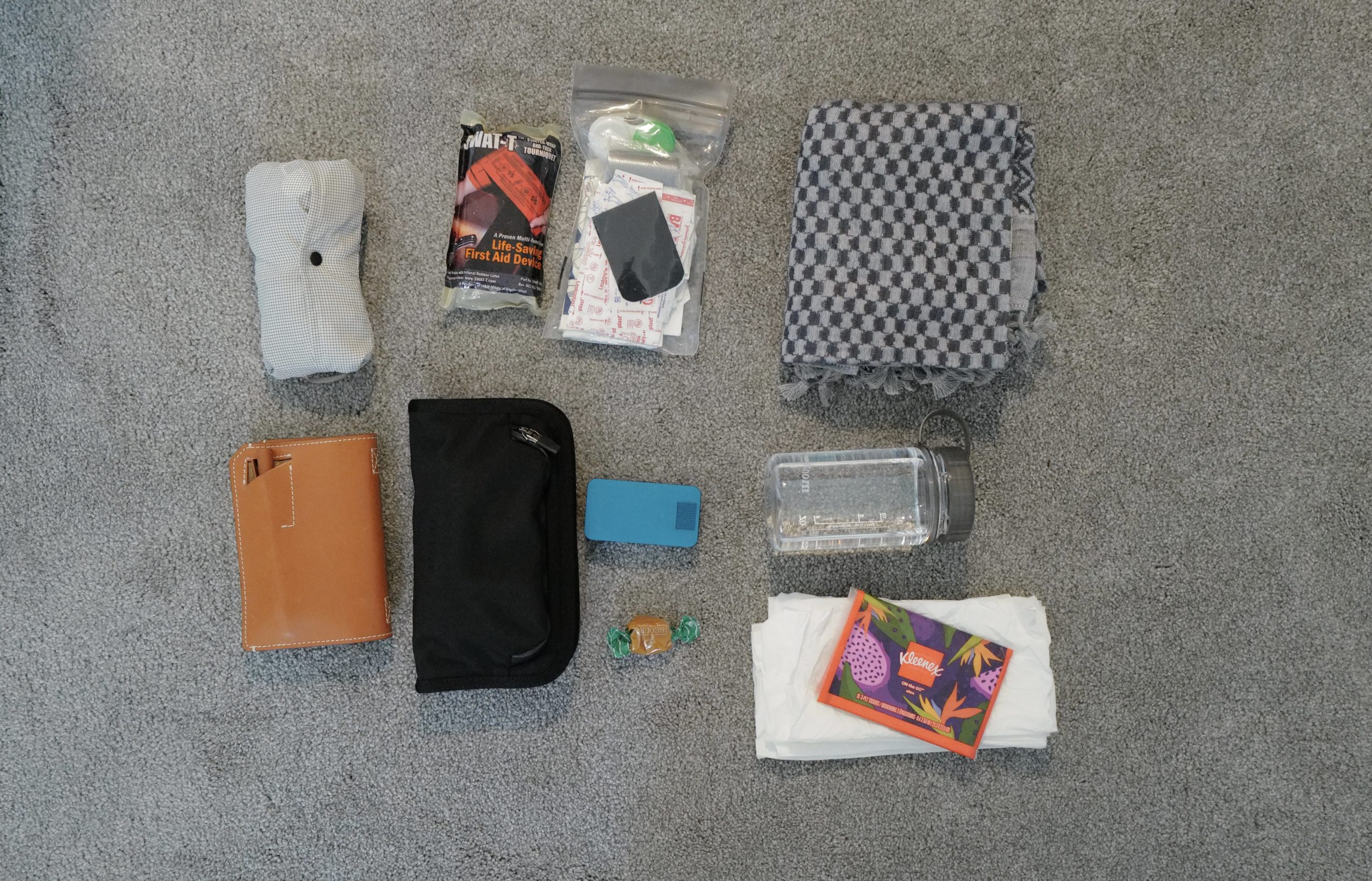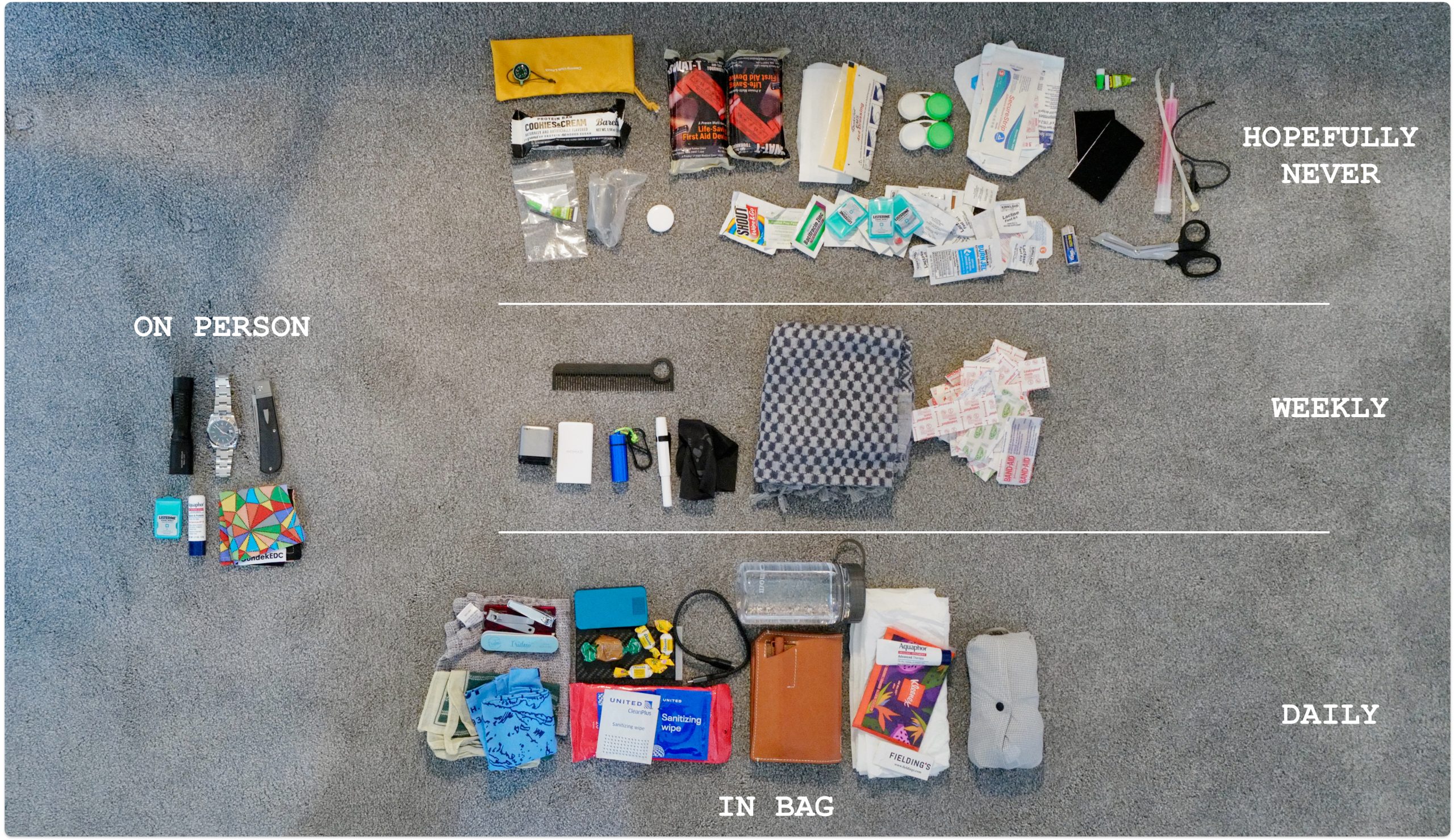 Everything you need daily should be compact enough for what you do daily, such that you can always keep it on your person. In a bag or not, whatever on your person means to you.
