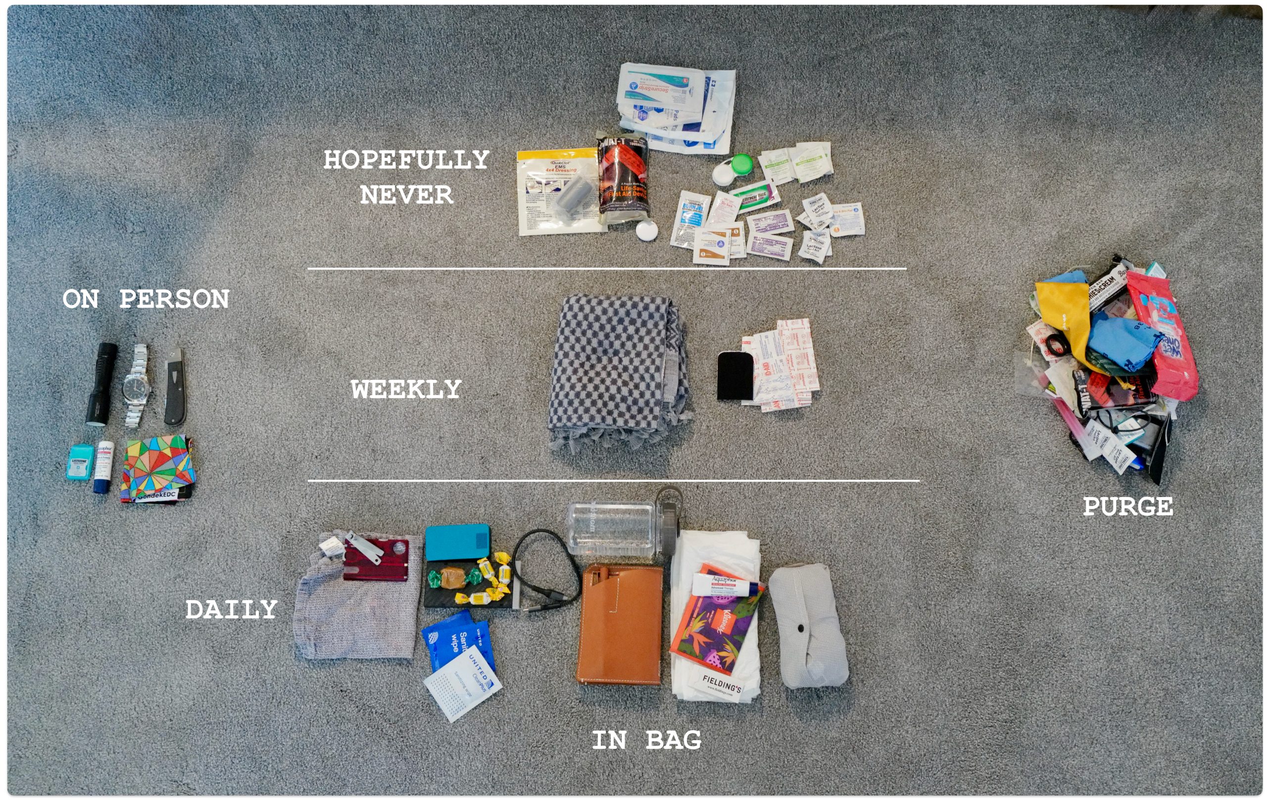 Now sorted by where I’ll carry it, and how often I’ll use it: