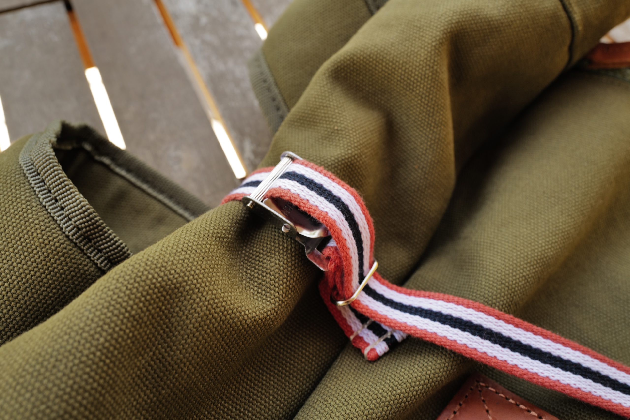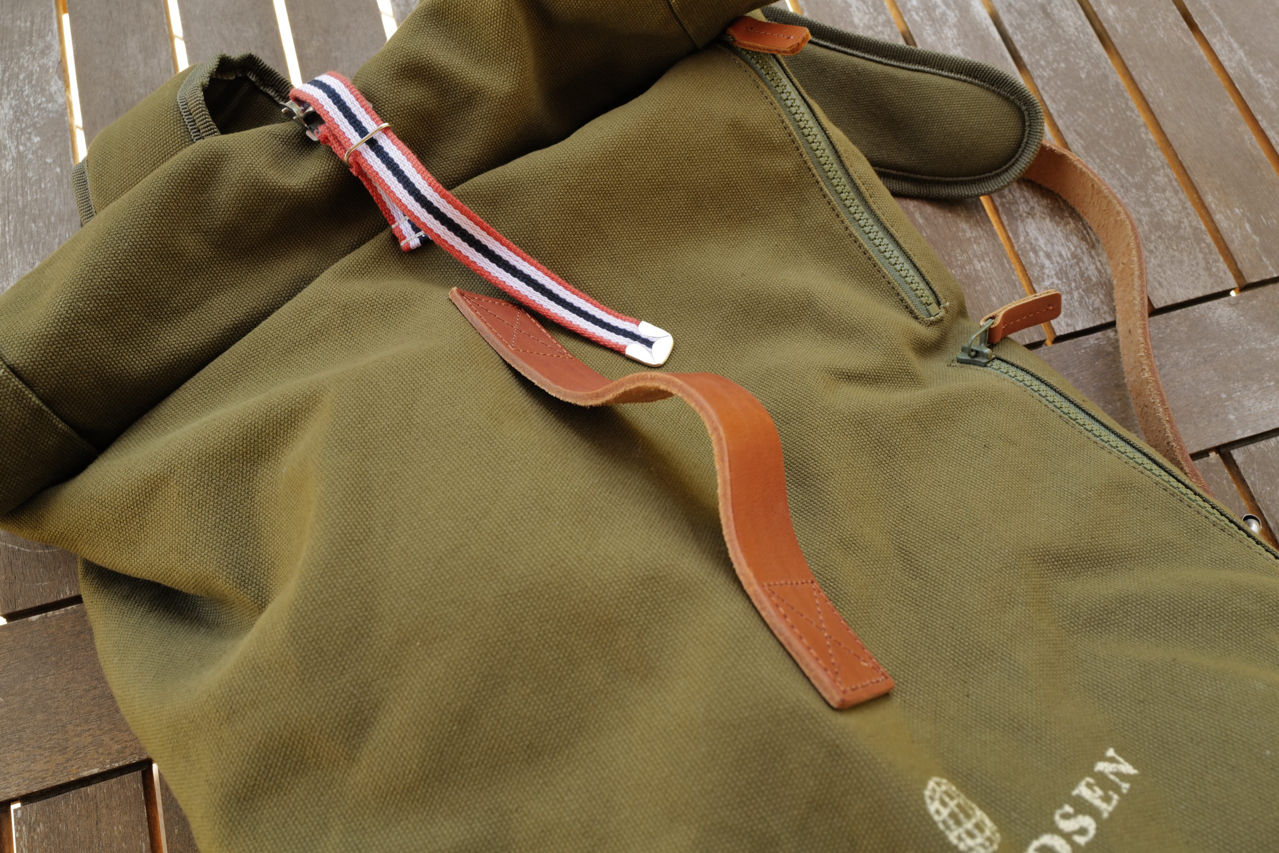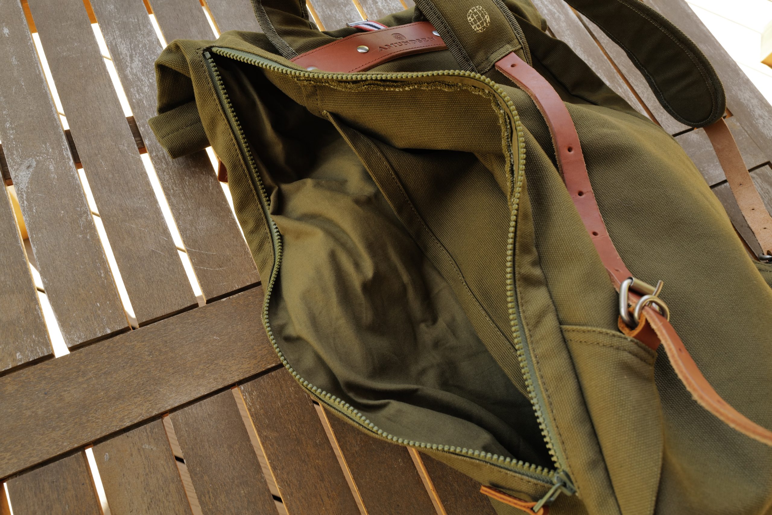 This bag is 100% cotton canvas with leather straps and other leather details. It’s rated at 25L and the stated dimensions are: 26” x 13.8” x 5.9”. There’s three zippers (YKK vislon) and a roll top with a very fiddly little metal buckle.