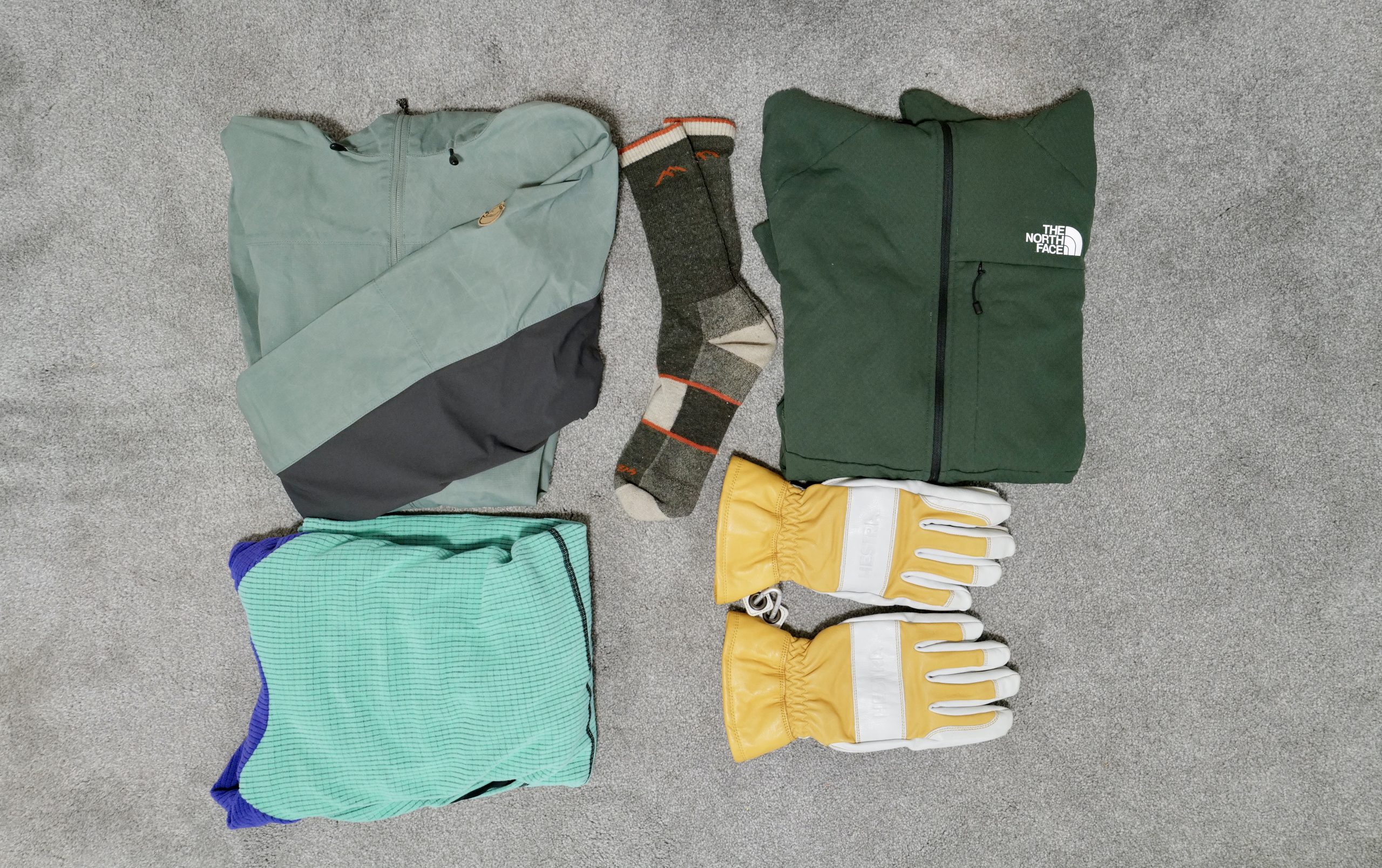 Top, left to right: Abisko Trekking Jacket; Dark Tough Socks; TNF FutureFleece. Bottom, left to right: Melanzana Grid Fleece, Hestra gloves.