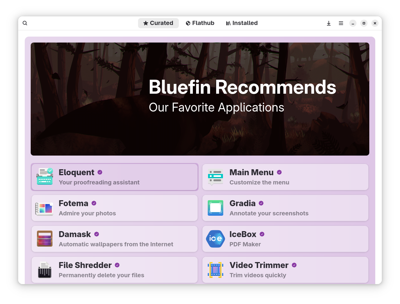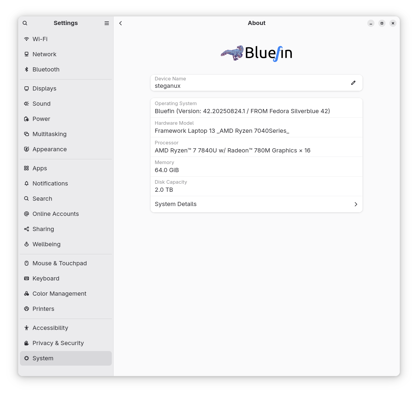 - Framework machine with Fedora. The Fedora core seems to give the best battery life on Framework hardware, and the Framework hardware itself is quite good and well priced. If you want something a little rosier than Fedora, I use Project Bluefin which I’ve found to be fantastic, but a little trickier to extend in the normal Linux ways.