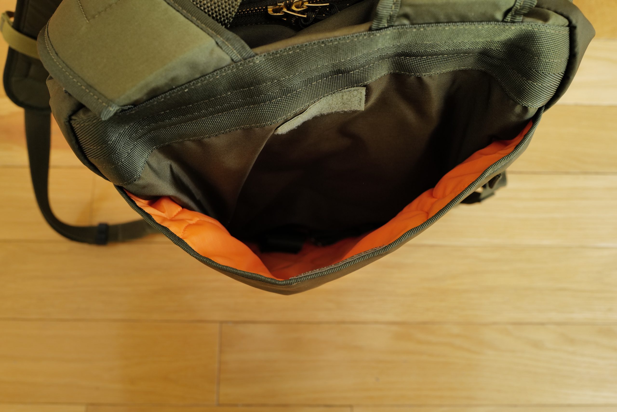 Behind the lower compression strap on both sides is three rows (two column) of MOLLE webbing, which is a different color and webbing than the strap. They are functional, but thankfully very hidden as well. The bag’s zippers are insanely smooth brass zippers which glide easily. There’s no weather flap on the main compartment so it’s a breeze to open.