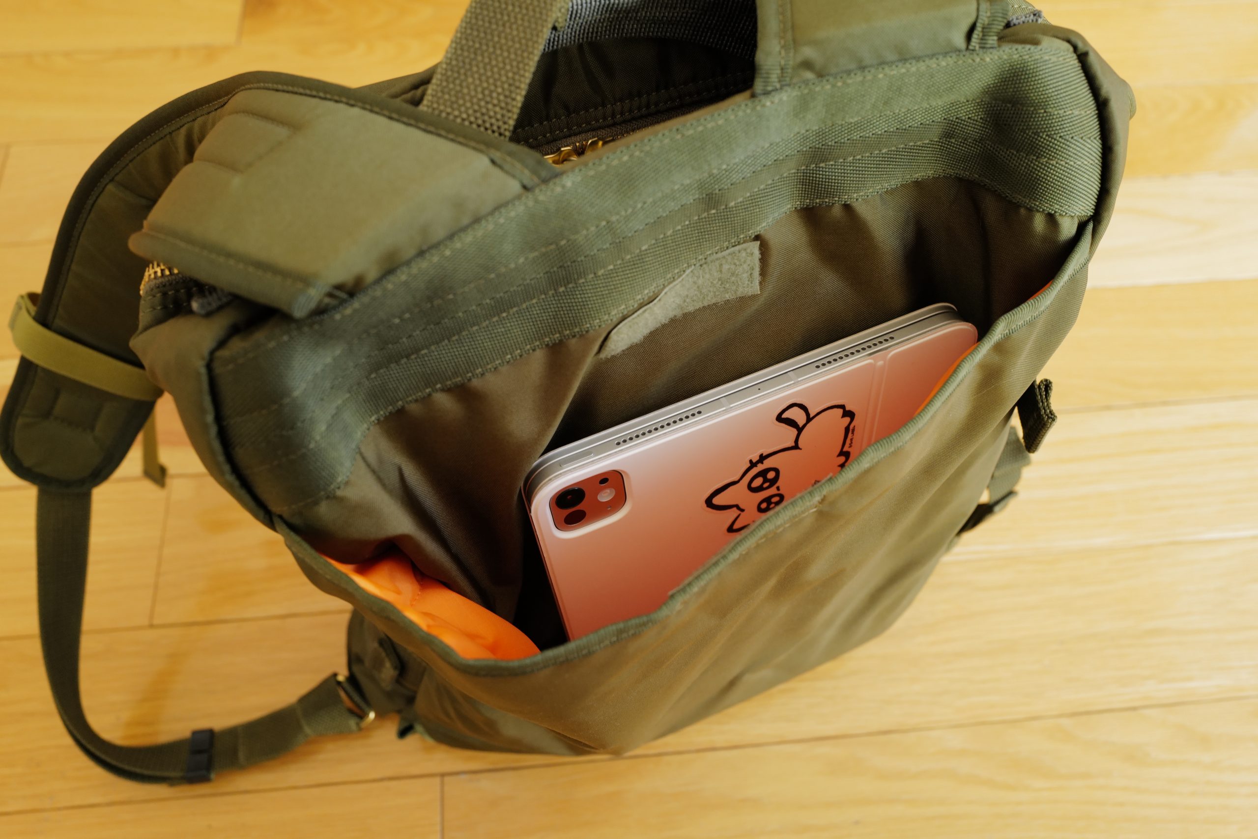Now, those same attributes are going to be a make or break for people. There is no real laptop compartment on this. Inside the bag is a removable hanging pocket which is more or less shaped like it would fit a water bladder. On the back panel of the bag, on the outside, is a top loading pocket secured with a strip of Velcro, it’s too short for anything but my 11” iPad Pro to slip in (and is where you hide away the waist strap). And while the main compartment is quilted, it’s not a lot of padding, so you’d want to put your laptop in a sleeve for sure.