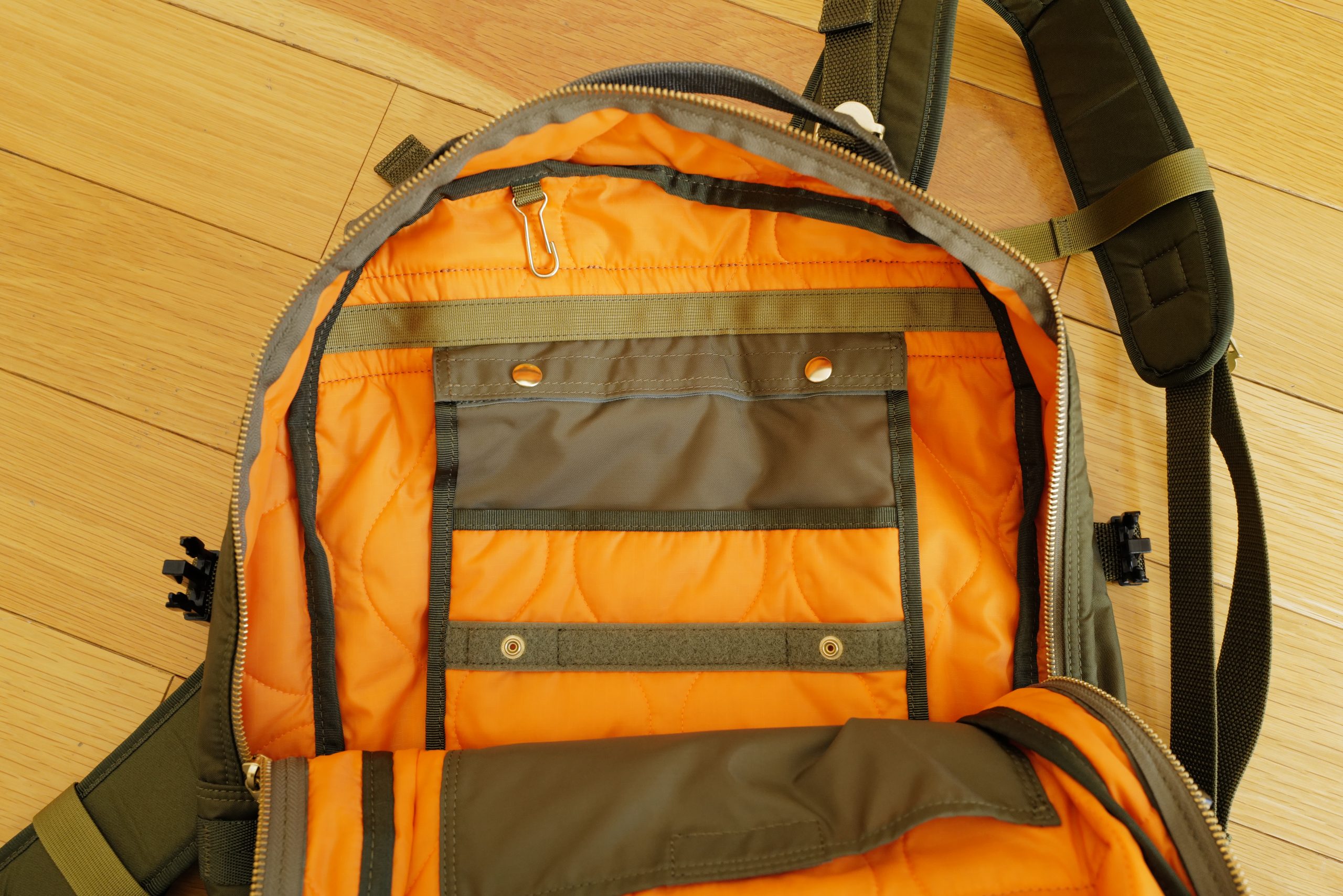 As mentioned this is quilted, so there’s just enough padding, but not so much that the bag cannot be nearly smashed flat. The hanging pocket is an odd size, there’s not way around that. It snaps out, and can then snap closed so you can take it with you, or leave it in place. The interior here is orange, and there’s a front pocket which is deep with a single Velcro closure.