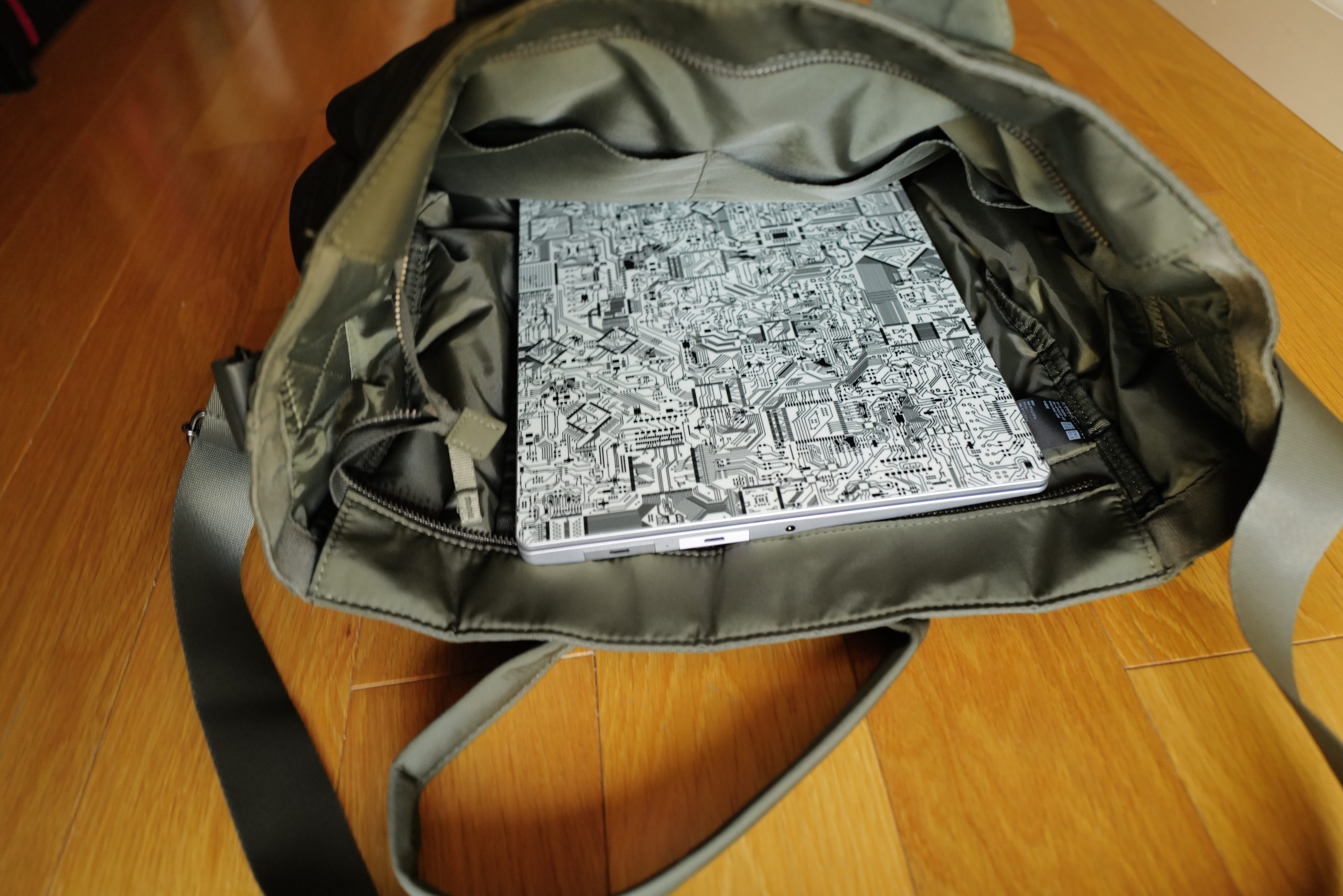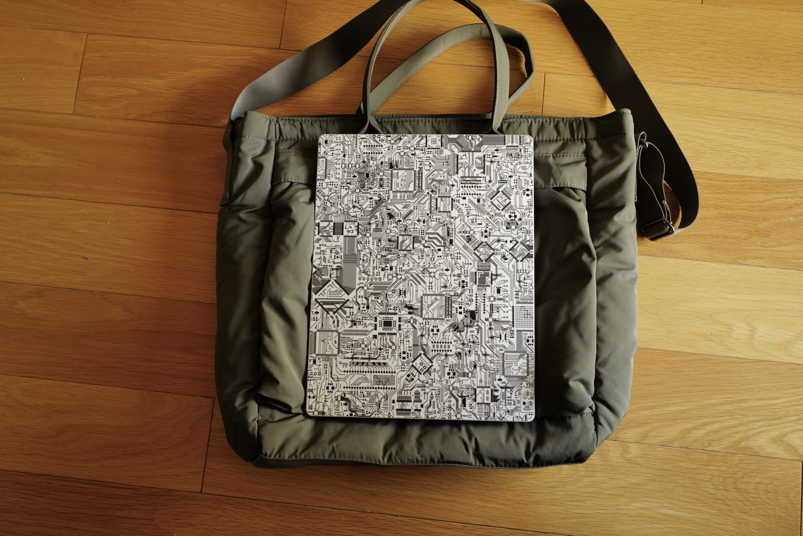 The bag completely lacks structure, which is perhaps the biggest downside. It will not sit on the floor without leaning on something and can be quite frustrating in general when trying to neatly place the bag out of the way. (The Porter bags, generally, do not have this same issue despite being similar.) Once you add in a laptop, or use the pockets, stuff gets even more frustrating. I’ve found that with a laptop, one pouch, and one notebook — things quickly end up laying at a sharp angle inside the bag, which digs into your side and makes the bag very annoying to carry.