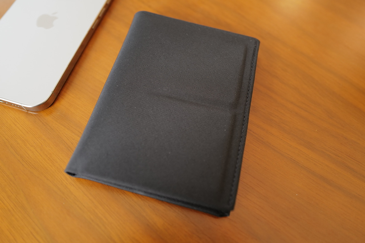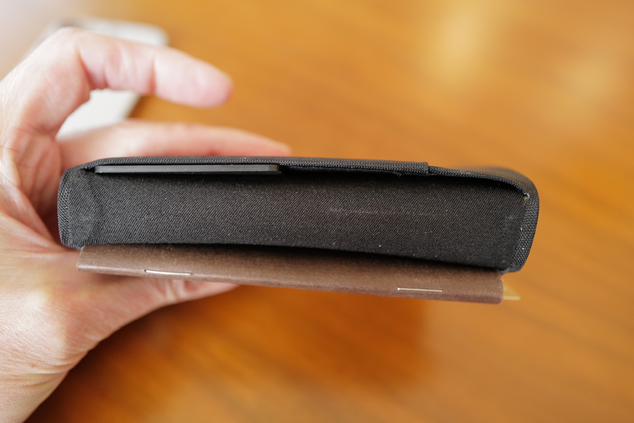 You can carry a passport or notebook two ways: in the 3D molded sleeve, which has you drop the passport in from the top on the right-side pocket, or you can slide the back cover behind that pocket. As most travelers know, you always need your passport bare, so it’s nice to have a wallet that recognizes that. But for notebook-carrying folks, it’s also very nice that you can slide the back cover in and use it like a booklet.