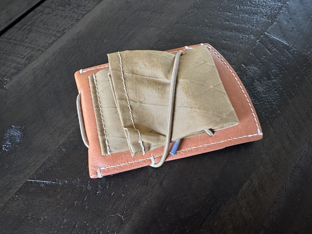 The materials are amazing, this leather is outstanding. The touch of elastic shock cord and Xpac somehow doesn’t detract from the looks, but alludes to something more. It looks put together when you pull it out of your pocket, but it doesn’t look Costanza. It’s the perfect balance.